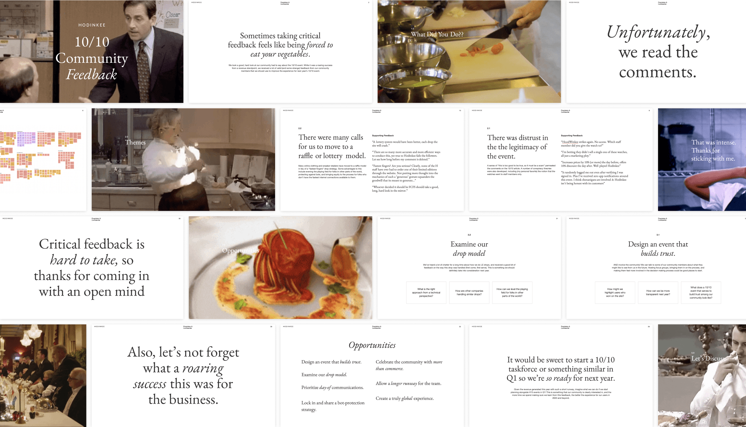 From there, I made a deck, and shared out the themes and findings with the rest of the company. It wasn’t fun. It felt like everyone was really excited about the event, and the results, and I was kind of a buzzkill. But, not unlike eating your vegetables, taking a hard look at your user feedback can be lame sometimes. It was really well received overall, and I’m glad we did it. It gave us a lot to learn from going into 10/10 for 2023.